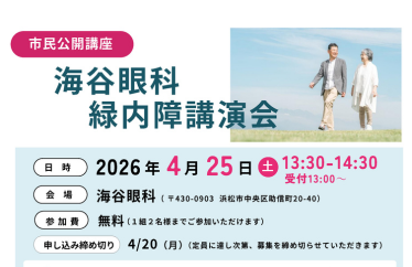 ■市民公開講座申込受付開始のお知らせ■4月25日に「海谷眼科 緑内障講演会」を開催いたします。海谷眼科緑内障センター山本哲也医師による講演と質疑応答を予定しております。是非お越しください。